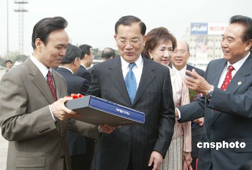 四月三十日,中國(guó)國(guó)民黨主席連戰(zhàn)結(jié)束北京之行啟程前往西安,中共中央臺(tái)辦主任陳云林、北京市委副書記龍新民在機(jī)場(chǎng)為其送行。圖為連戰(zhàn)獲贈(zèng)北京之行紀(jì)念像冊(cè)分外驚喜。作者:廖文靜