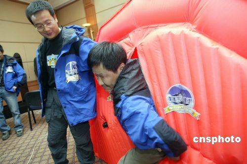四月二十一日,由北京三夫戶外運(yùn)動(dòng)俱樂部發(fā)起并成立、聯(lián)想集團(tuán)公司冠名贊助的一支民間科學(xué)考察隊(duì)伍-聯(lián)想鋒行科學(xué)考察探險(xiǎn)隊(duì)在北京正式成立,將于今年五月份對可可西里(藏北、新疆阿爾金山區(qū)域)進(jìn)行由南至北的穿越式科學(xué)考察活動(dòng),最重要的科考內(nèi)容是與北京大學(xué)環(huán)境學(xué)院聯(lián)合進(jìn)行的“青藏高原可可西里地區(qū)表土POPs分布調(diào)查”項(xiàng)目,這項(xiàng)科考內(nèi)容在中國還是第一次。本次科考探險(xiǎn)活動(dòng)將從五月一日開始,歷時(shí)二十二天,行程六千多公里,其中穿越無人區(qū)達(dá)一千六百多公里。圖為科考探險(xiǎn)隊(duì)隊(duì)員演示一個(gè)酷似帳篷的便攜式高壓氧艙。作者:盛佳鵬
