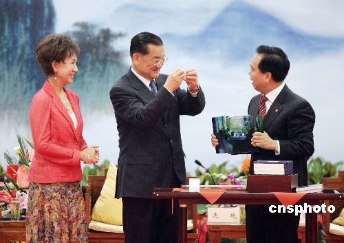 中共陜西省委書(shū)記李建國(guó)四月三十日晚在西安會(huì)見(jiàn)并宴請(qǐng)中國(guó)國(guó)民黨主席連戰(zhàn)和他率領(lǐng)的大陸訪問(wèn)團(tuán)成員。圖為連戰(zhàn)向李建國(guó)回贈(zèng)禮物。作者:毛建軍