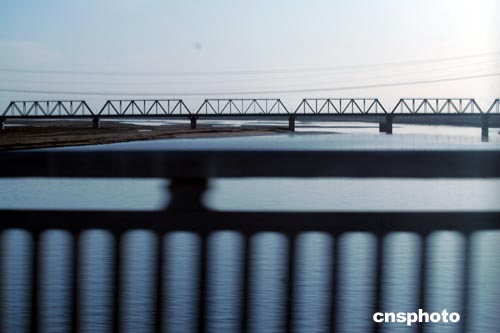 中新網(wǎng)5月1日電 二零零五年五月一日,穿越可可西里聯(lián)想鋒行探險隊車隊行進在內(nèi)蒙古京呼高速公路上的黃河大橋。