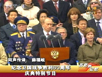 5月9日,俄羅斯在莫斯科紅場(chǎng)舉行紀(jì)念衛(wèi)國(guó)戰(zhàn)爭(zhēng)勝利60周年慶典。圖為俄羅斯總統(tǒng)普京發(fā)表講話。(央視截圖)