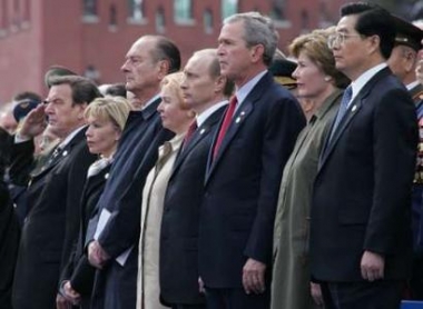 獻(xiàn)花結(jié)束以后,各國(guó)領(lǐng)導(dǎo)人在一旁的小廣場(chǎng)集體合影,接著出席普京總統(tǒng)在克里姆林宮大會(huì)堂六層宴會(huì)廳舉行的紀(jì)念衛(wèi)國(guó)戰(zhàn)爭(zhēng)勝利六十周年宴會(huì)。