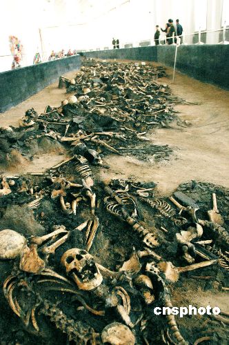 如今,在慘案現(xiàn)場建立的“平頂山慘案紀念館”內(nèi),已經(jīng)實地挖掘出八百多具遇難同胞的骨骸。那是一幅無法想象的悲慘景象:燒焦的木頭,干癟的汽油桶,層層疊疊的尸骨,尸骨上還清晰可見深深的彈孔和刀痕。從一具具保持著匍匐爬行姿勢的遺骨,完全可以想象出遇難同胞臨死前的頑強與悲憤。最令人悲痛震撼的是一具懷著胎兒的母親骨骸,依稀可見小生命在母親腹中掙扎的慘狀。而在這具孕婦尸骨旁邊,竟還有一具襁褓中的嬰兒骨骸,一個出生不久的小生命竟遭受如此殘害毀滅,可見屠殺者的喪心病狂與無比殘暴。