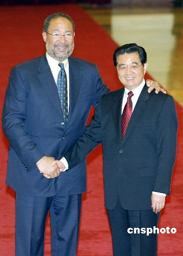 五月十六日晚,二○○五北京《財(cái)富》全球論壇在北京人民大會(huì)堂開幕。中國(guó)國(guó)家主席胡錦濤在開幕式前會(huì)見參會(huì)的VIP嘉賓,圖為與時(shí)代華納公司董事長(zhǎng)理查德·帕森里握手。作者:廖文靜