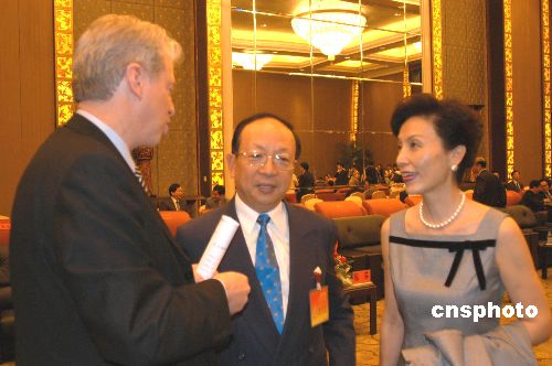 五月十七日晚,前來參加第七屆海峽兩岸經(jīng)貿(mào)交易會的臺灣知名人士蔣孝嚴與夫人黃美倫在福州香格里拉大酒店與海外工商界人士親切交談。作者:福建分社