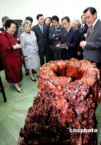 | 五月十九日,二零零五年日本愛知世屆博覽會中國館日活動隆重舉行。中國國務(wù)院副總理吳儀(左二)出席,并與日本前首相橋本龍?zhí)?右二)等貴賓一起參觀中國館內(nèi)的紫檀齋。二零零五年日本愛知世博會中國館主題為“自然、城市、和諧--生活的藝術(shù)”,中國館的展出通過博大精深的中國文化的演繹,表達了中國人“天人合一”的哲學思想。圖為中國紫檀博物館館長陳麗華(左一)向來賓介紹精湛的紫檀工藝品。作者:毛建軍