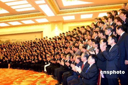五月二十日,中國(guó)國(guó)務(wù)院總理溫家寶、國(guó)務(wù)委員唐家璇、全國(guó)政協(xié)副主席劉延?xùn)|、全國(guó)政協(xié)副主席羅豪才、國(guó)務(wù)院僑辦主任陳玉杰等在北京人民大會(huì)堂會(huì)見“第三屆世界華僑華人社團(tuán)聯(lián)誼大會(huì)”的全體與會(huì)代表并合影留念。作者:張勤