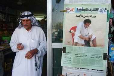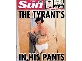 在巴格達的咖啡店,伊拉克人正在觀看一些阿拉伯衛(wèi)星電視臺播放《太陽報》頭版刊登的照片,其中一張就是薩達姆只穿內褲站著的照片!短枅蟆愤刊登著薩達姆在洗衣服、睡覺以及在獄中踱步等鏡頭。