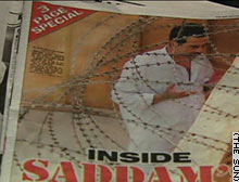 中新網(wǎng)5月22日電 《太陽報(bào)》最新刊出的薩達(dá)姆“監(jiān)獄生活照”是一幅大彩照,薩達(dá)姆身著白色長袍站在蛇形鐵絲網(wǎng)后面,手掌張開頭微低,像是在做禱告,也有人將其解讀為正在散步,并且同什么人在交談。(春風(fēng))
