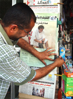 5月21日的英國《太陽報》再次刊登了薩達姆在獄中的照片,圖為伊拉克的報亭出售刊有相關(guān)圖片的報紙。 (春風(fēng))