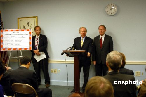 | 美國參議員喬.利伯曼(講話者)和拉馬爾.亞歷山大(前右一)二十五日聯(lián)合提出一項議案,要求美國聯(lián)邦政府從二00六年到二0一一年的五個財政年度內(nèi)撥款十三億美元,全面促進美中在教育、學(xué)術(shù)、商業(yè)等方面的交流與接觸,并在美國中小學(xué)加強中文教育。作者:余東暉