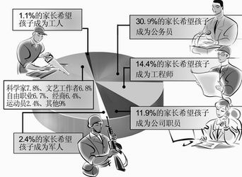 中新網(wǎng)5月30日電 據(jù)新民晚報(bào)報(bào)道,你希望孩子將來(lái)做什么?近三分之一的家長(zhǎng)選擇了公務(wù)員,只有1.1%的家長(zhǎng)希望孩子成為工人。日前由市質(zhì)量協(xié)會(huì)用戶評(píng)價(jià)中心發(fā)布的《上海中小學(xué)生成長(zhǎng)質(zhì)量調(diào)查報(bào)告》揭示了當(dāng)前家庭教育中存在的不少問(wèn)題。