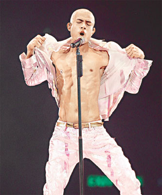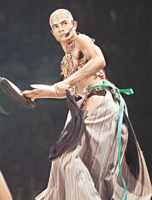 中新網(wǎng)6月2日電 據(jù)香港媒體報道,郭富城《舞臺寶典@飛越舞林演唱會2005二部曲》前晚于紅館開鑼,城城施展渾身解數(shù),以無數(shù)個性感的突破熱爆會場,光頭造型戴乳飾露股肉加上欲望翼,都可見城城于舞臺上別具一格,造型獨特。