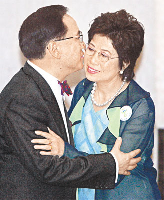 當曾蔭權(quán)走下講臺時,立刻與迎上前去的太太鮑笑薇擁抱。此時,他的競選助手們正向媒體散發(fā)內(nèi)涵含講詞和政綱的彩色講義冊,開啟處被設(shè)計成上方有一藍色煲呔的淡綠西裝樣式。而冊子的背后,則是曾太寫有施政理念“強政勵治,締造和諧,福為民開”的十二字書法,抬首處是一枚篆刻小章“自強不息”。(完)
