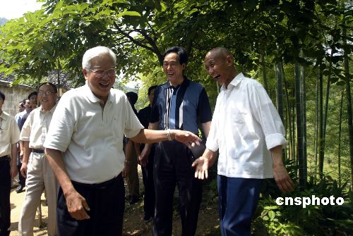 | 六月四日,全國(guó)政協(xié)副主席、全國(guó)政協(xié)副主席、中國(guó)致公黨中央主席羅豪才,率領(lǐng)致公黨中央的部分領(lǐng)導(dǎo)和一大批專家學(xué)者、實(shí)業(yè)家,由中共中央統(tǒng)戰(zhàn)部副部長(zhǎng)黃躍金以及當(dāng)?shù)仡I(lǐng)導(dǎo)的陪同下,到安徽省安慶市潛山縣茶莊村進(jìn)行大別山區(qū)扶貧調(diào)研。圖為羅豪才(左)與當(dāng)?shù)卮迕裥φ劽撠氈赂灰约稗r(nóng)村果樹種植。作者:盛佳鵬