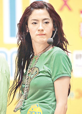昨天柏芝穿上綠色T恤襯低腰褲作hip hop打扮,跳舞時(shí)卻配上“特別效果”,胸前出現(xiàn)“凸點(diǎn)”現(xiàn)象之余,黑色內(nèi)褲邊也隨著拍子頻頻曝光。柏芝更是語(yǔ)出驚人,在與fans跳舞時(shí),她竟向fans說(shuō):“你用下面(下半身)頂住記者就得!笔植晃摹.(dāng)她唱《新聞女王》時(shí),有人假扮狗仔隊(duì)偷拍她,柏芝就用屁股把他頂開。