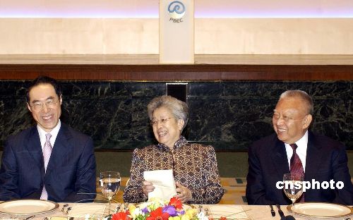 6月13日,國(guó)家副總理吳儀與全國(guó)政協(xié)副主席董建華(右)及香港署理行政長(zhǎng)官唐英年(左)出席太平洋地區(qū)經(jīng)濟(jì)理事會(huì)開幕主題演講午餐宴會(huì)。作者:洪少葵
