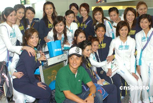 香港歌星方力申13日“率領(lǐng)”20位候選港姐乘坐斯里蘭卡航空公司航班奔赴馬爾代夫﹑斯里蘭卡﹑泰國拍攝外景﹐在香港機(jī)場與候選港姐合影。作者:趙振清