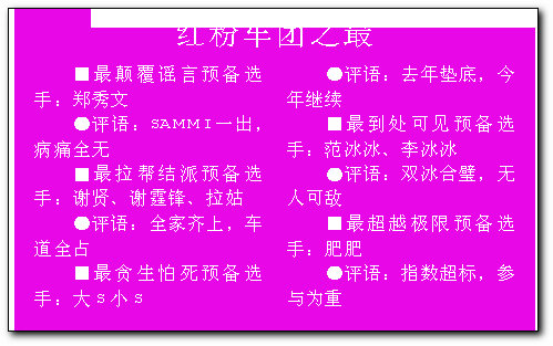 目前報(bào)名加入紅粉車團(tuán)的女星陣容簡(jiǎn)直令人“觸目驚心”:容祖兒、黃奕、李心潔、大小S是去年的舊將,而蔡依林、鄭秀文這樣的超級(jí)天后加盟,令席位爭(zhēng)奪戰(zhàn)變得異常激烈。另外,更有謝霆鋒母親拉姑、肥肥沈殿霞的加入,讓人懷疑是否要特制跑車,而向來和成龍大哥關(guān)系不錯(cuò)的韓國(guó)美女金喜善也榜上有名,更令爭(zhēng)奪國(guó)際化。