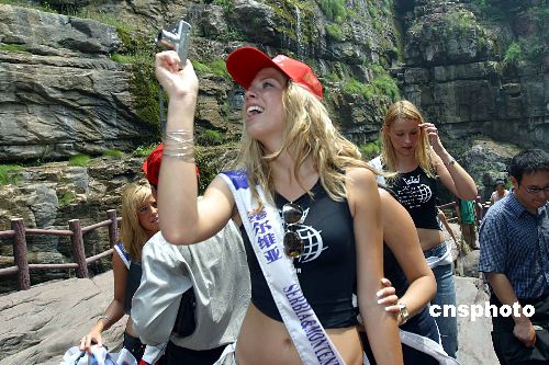 六月十四日,國際旅游小姐大賽參賽佳麗在云臺山天瀑下留影。國際環(huán)球旅游小姐河南巡游行最后一站在河南焦作云臺山世界地質公園,云臺山園區(qū)是中國國家森林公園,世界地質公園,山勢險峻、溝壑縱橫、常年云纏霧繞。擁有紅石峽、泉瀑峽、云臺天瀑、潭瀑峽、情人瀑等具有世界地質特征的重要景點。