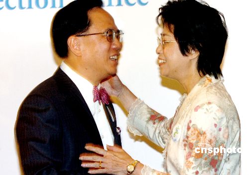 曾蔭權(quán)在16日晚的記者會上與夫人相擁祝賀。