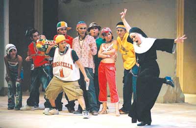 很多人都對(duì)黑人女星烏比·戈德堡主演的喜劇電影《修女也瘋狂》記憶猶新,《跑路救天使》即改編自此片。該劇在2004年由臺(tái)灣果陀劇場(chǎng)推出,當(dāng)時(shí)曾創(chuàng)下連演31場(chǎng)場(chǎng)場(chǎng)爆滿(mǎn)的記錄,很多場(chǎng)次中謝幕時(shí)間竟長(zhǎng)達(dá)30分鐘。而果陀劇場(chǎng)也是臺(tái)灣戲劇界的重要組成部分,它一直致力于“中文歌舞劇”的演出,獲得過(guò)多項(xiàng)表演大獎(jiǎng),被業(yè)內(nèi)人士稱(chēng)為“東方百老匯”。有意思的是該劇中還使用了很多觀(guān)眾耳熟能詳?shù)牧餍懈枨,像《讀你》、王菲的《我愿意》、張惠妹的《姐妹》、劉文正的《誰(shuí)在眨眼睛》等等,而且風(fēng)格與我們熟悉的曲調(diào)有了很大改變,像《讀你》就被唱出了“圣歌”的味道。