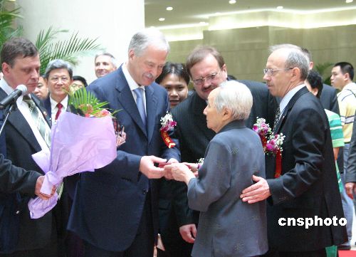 | 六月十八日,俄羅斯國家杜馬主席格雷茲洛夫出席了重慶市直轄八周年紀念活動和《紀念二戰(zhàn)勝利六十周年圖片展》開幕式,并參觀了蘇軍烈士紀念墓和原蘇聯(lián)大使館重慶舊址。圖為格雷茲洛夫(左二)向東北抗日聯(lián)軍老戰(zhàn)士胡真一女士(右二)頒發(fā)“偉大的衛(wèi)國戰(zhàn)爭勝利六十周年紀念章”。作者:郭晉嘉