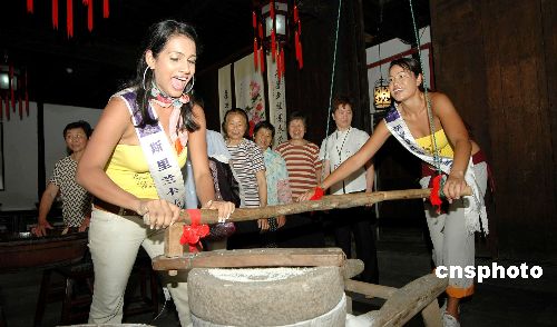 六月二十日,參加二○○五國(guó)際旅游小姐世界最佳民族服裝冠軍大賽的選手們?cè)谥芮f進(jìn)行采風(fēng)活動(dòng),選手們?cè)谒l(xiāng)古鎮(zhèn)周莊游覽了雙橋、貞豐文化街的酒作坊、竹草編坊、聚賓樓等。圖為傳統(tǒng)的石磨吸引了參賽選手。作者:蔣振江