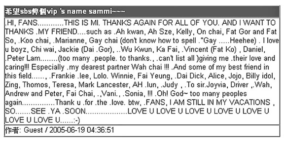 其實自Sammi接拍《長恨歌》以來,關(guān)于其身體及精神狀況的傳聞一直沒完沒了,曾志偉早前透露梅艷芳的逝世對她打擊很大,更有意退出娛樂圈。不過,Sammi為安撫歌迷,曾化名“Mi”以英文在網(wǎng)上留言,表示自己身體很好。剛過去的星期天,她更兩度在網(wǎng)上留言,除了祝愿天下父親“父親節(jié)快樂”外,更于凌晨時分留言答謝一眾好友,當中包括安仔、古天樂、古巨基、陳慧琳及劉德華等,可見Sammi與安仔關(guān)系依然要好。