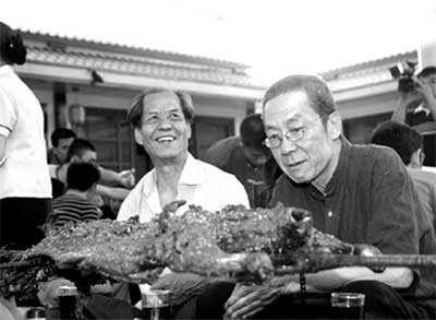 剛剛從延安回來(lái)的陳忠實(shí),帶著話劇版導(dǎo)演林兆華、主演濮存昕在白鹿原上轉(zhuǎn)悠了一天,據(jù)說(shuō)收獲不小。晚上,當(dāng)?shù)卮迕窠M織了對(duì)北京人藝一行的歡迎活動(dòng)。四方小凳、鐵皮桌、山野菜、架子上散發(fā)著香味的烤全羊,濃濃的鄉(xiāng)土氣息讓一路走來(lái)的濮存昕有些激動(dòng)。濮存昕很紳士,非要等到對(duì)面的陳忠實(shí)、林兆華落座后才緩緩坐下。