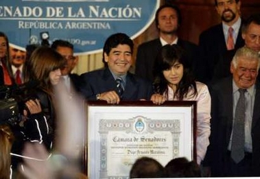 中新網(wǎng)6月22日電 走在紅地毯上,在眾多知名政客的簇?fù)硐拢⒏⑶蛐邱R拉多納從阿根廷副總統(tǒng)兼參議院議長肖利手里接受了國會榮譽(yù)勛章。