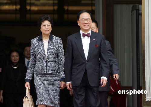 香港特區(qū)行政長(zhǎng)官曾蔭權(quán)六月二十四日在北京人民大會(huì)堂香港廳宣誓就職。曾蔭權(quán)在完成就職宣誓儀式并與溫家寶總理會(huì)見后,喜氣洋洋走出人民大會(huì)堂。作者:毛建軍
