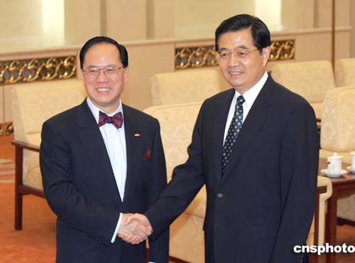 中新網(wǎng)6月24日電(記者邢利宇)國家主席胡錦濤今天下午在人民大會堂會見了剛剛就任的香港特別行政區(qū)行政長官曾蔭權(quán),并同他進(jìn)行了親切的談話。