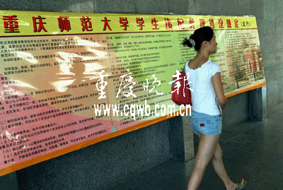 重慶師范大學(xué)學(xué)生處張老師介紹,《管理規(guī)定》是嚴(yán)格遵守重慶市教委《高等學(xué)校制定和修改學(xué)生管理制度》中第四十二條“有損大學(xué)生形象、有損社會公德”的精神來修訂的,于5月22日正式試行,6月中旬制成展板,放到學(xué)生出入較多的一教樓,希望學(xué)生發(fā)表自己的看法。但是,直到昨日,沒有一個(gè)學(xué)生到學(xué)生處反饋意見。