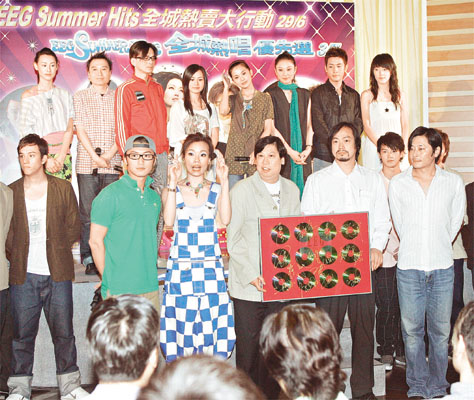 為挽救低迷唱片市道,英皇昨安排旗下歌手容祖兒、謝霆鋒、Twins、鄭希怡、達(dá)明一派、梁洛施、關(guān)智斌、Boy'z等齊集“1212+”餐廳出席記者會(huì),宣布將于暑假發(fā)起連串大型宣傳,包括Twins于七月一日踩入旺角,而七月三日英皇全體歌手將在九龍灣國(guó)際展貿(mào)中心舉行音樂(lè)會(huì)。