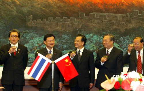 中新網7月1日電 據(jù)新華網報道,在中泰兩國建交30周年之際,10項雙邊經貿合作協(xié)議于1日在北京簽署,項目內容涉及能源、礦產、食品、零售等多個領域。國務院副總理回良玉和泰國總理他信共同出席了簽字儀式。