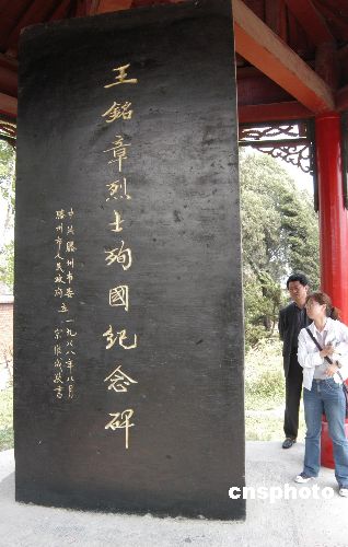 記者懷著崇敬的心情來到山東省滕州市烈士陵園,拜偈當(dāng)年滕縣保衛(wèi)戰(zhàn)中為國捐軀的王銘章將軍等英烈。王銘章的紀(jì)念碑廳靜靜地坐落在西北面。紀(jì)念碑上的碑文記載:一九三七年日寇挑起“七·七”事變,王銘章師長預(yù)立遺囑,誓死殺敵報國,遂率八千巴蜀健兒出川北上抗日。