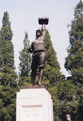 在亭、館間兩條對(duì)角線交點(diǎn)上,是翠柏簇?fù)淼亩嫒鹆沂克芟瘛S⑿凵碇娧b,昂首挺胸,左手高擎炸藥包,右手緊握拉開的導(dǎo)火索,再現(xiàn)了董存瑞視死如歸的英雄氣概。