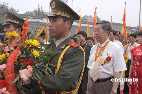 在古樂和廟內(nèi)古箏的伴奏下,參祭隊(duì)伍按順序列隊(duì),由禮儀人員引導(dǎo),全國(guó)人大常委會(huì)副委員長(zhǎng)許嘉璐,澳門基金會(huì)行政委員吳志良、臺(tái)灣時(shí)報(bào)周刊名譽(yù)董事長(zhǎng)簡(jiǎn)志信等參祭人士,在兩位武警禮兵的協(xié)助下,進(jìn)入廟內(nèi)敬獻(xiàn)花籃、行禮。