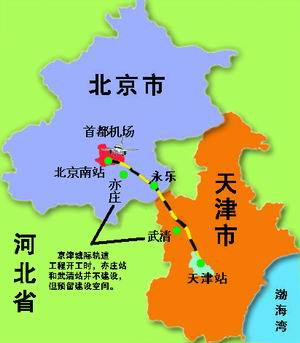 專(zhuān)家介紹,京津城際軌道交通工程由北京南站東端引出,沿既有京山鐵路線南側(cè)向東,過(guò)亦莊工業(yè)園區(qū)、永樂(lè)新城至天津楊村后,再沿既有京山線北側(cè)至天津站。此線建成運(yùn)營(yíng)后,最小行車(chē)間隔為三分鐘,北京、天津間全程直達(dá)運(yùn)行時(shí)間為半個(gè)小時(shí)左右。