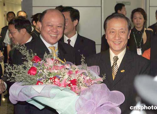 新黨大陸訪問(wèn)團(tuán)今天上午從臺(tái)北啟程,乘坐華航飛機(jī)抵達(dá)香港后,再轉(zhuǎn)乘CZ三0四航班于當(dāng)日下午二時(shí)四十分飛抵廣州白云機(jī)場(chǎng)。中共廣東省委常委、秘書長(zhǎng)肖志恒和中臺(tái)辦主任助理張銘清、廣東省臺(tái)辦主任甘兆勝等到機(jī)場(chǎng)迎接郁慕明,雙方握手寒暄后,一位廣州女青年向郁慕明獻(xiàn)上鮮花。郁慕明及訪問(wèn)團(tuán)一行在機(jī)場(chǎng)貴賓室作短暫停留后,乘車前往下榻的廣州東方賓館。