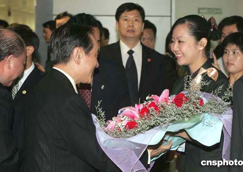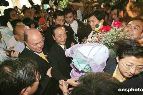 由臺(tái)灣新黨主席郁慕明率領(lǐng)的臺(tái)灣新黨紀(jì)念抗戰(zhàn)勝利六十周年大陸訪(fǎng)問(wèn)團(tuán)七月六日下午抵達(dá)廣州新白云國(guó)際機(jī)場(chǎng),受到熱情迎接。作者:毛建軍