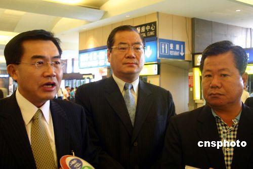 七月七日上午,國民黨“立委”李全教(左一)與國民黨中央政策會(huì)執(zhí)行長曾永權(quán)(中)、親民黨“立委”蔡勝佳(右一)在桃園機(jī)場接受采訪,介紹八日將在北京就臺(tái)灣水果登陸細(xì)節(jié)舉行的協(xié)商會(huì)議。作者:劉舒凌