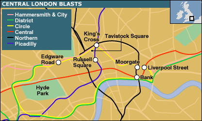 12點(diǎn)56分,英國(guó)內(nèi)政部官員告訴下議院,“一些恐怖分子攻擊”了倫敦中部。其中包括至少四次的爆炸。其中三起發(fā)生在地鐵,一起發(fā)生在公共汽車(chē)。羅素廣場(chǎng)和國(guó)王十字車(chē)站、摩爾門(mén)(Moorgate),歐德門(mén)和利物浦大街車(chē)站(Aldgate and Liverpool Street Underground),愛(ài)德華爾路車(chē)站(Edgware Road station和發(fā)生巴士爆炸的達(dá)維斯托克廣場(chǎng)(Tavistock Square)。