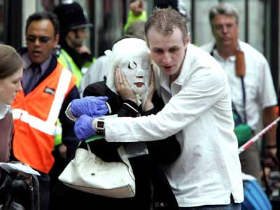 中新網(wǎng)7月7日電 據(jù)英國天空電視臺報(bào)道,當(dāng)?shù)貢r(shí)間7日倫敦發(fā)生了6起以地鐵公共汽車為目標(biāo)的恐怖襲擊,已造成至少90人傷亡。圖為救援人員護(hù)衛(wèi)一名傷者離開現(xiàn)場。(春風(fēng))