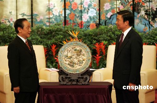 李源潮向新黨大陸訪問(wèn)團(tuán)贈(zèng)送了兩件禮物,一件是云錦“金絲盤(pán)龍”,另一件是金箔制作的《論語(yǔ)》。郁慕明贈(zèng)送給江蘇的仍舊是一個(gè)交趾燒陶盤(pán),主題是“祥獅獻(xiàn)瑞”,寓意團(tuán)圓和緣分。