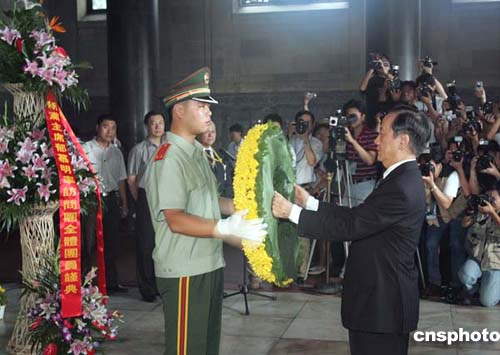 孫中山大理石坐像立于堂中,坐像前擺放著新黨大陸訪問團(tuán)敬獻(xiàn)的花籃。拜謁儀式開始,全體團(tuán)員默哀后,郁慕明代表訪問團(tuán)向?qū)O中山靈寢敬獻(xiàn)黃色花環(huán),訪問團(tuán)成員三鞠躬,向?qū)O中山先生致最致敬禮。隨后,每人手持一枝白色百合花的新黨大陸訪問團(tuán)成員依次走人墓門,向?qū)O中山先生靈寢獻(xiàn)花致敬。