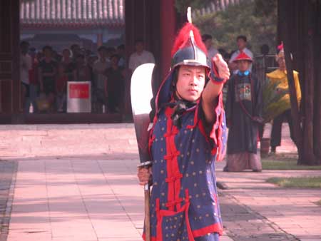 中新網(wǎng)7月9日電 在承德避暑山莊,每天早上八點“開園”時都會舉行熱鬧的清朝宮廷古裝儀式表演。