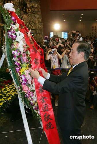 臺(tái)灣新黨主席郁慕明率領(lǐng)的臺(tái)灣新黨“民族之旅”訪(fǎng)問(wèn)團(tuán)七月十一日在北京盧溝橋參觀中國(guó)人民抗日戰(zhàn)爭(zhēng)紀(jì)念館并敬獻(xiàn)花圈。作者:毛建軍