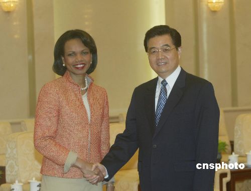 七月十日,中國國家主席胡錦濤在北京人民大會堂會見來訪的美國國務(wù)卿賴斯。作者:史利